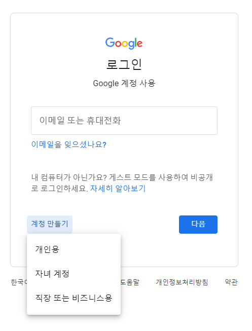 구글의 다양한 기능을 이용하기 위해서는 계정이 필요할 수 있습니다. 흔히 id와 비밀번호를 설정하느 것이 가장 중요하다고 합니다. 비밀번호는 복잡해야만 개인 보안이 지켜질 수 있기 때문이죠. 구글의 계정 id는 지메일 주소(id@gmail.com)의 형태로 이루어져 있습니다. 즉, 구글 로그인을 위한 id는 지메일 주소를 모두 입력해야만 합니다.