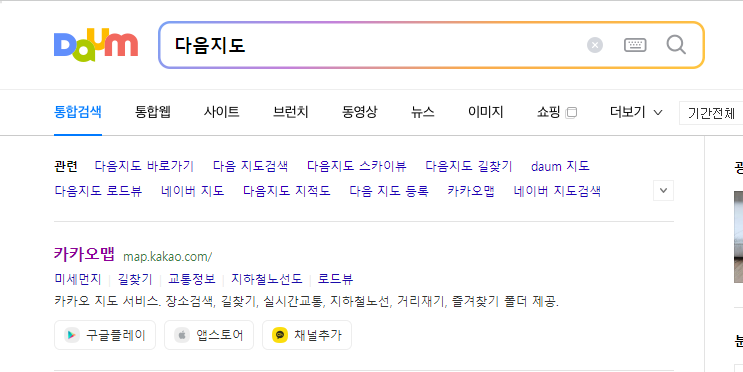 검색포털을 이용해 '다음 지도'를 검색하면 지도를 이용할 수 있는 검색 결과를 얻을 수 있습니다. 카카오와 통합되었기 때문에 '카카오맵'을 이용하시면 됩니다.