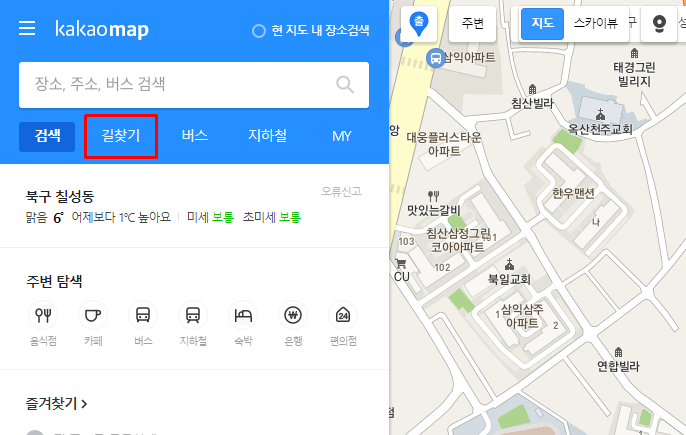 다음 지도 페이지에는 다양한 기능이 있습니다. 주소, 주변 탐색, 즐겨찾기, 새로운 장소, 검색, 길찾기, 버스, 지하철, MY등의 기능을 제공하고 있습니다. 여기서 우리의 목적인 길찾기를 선택합니다.