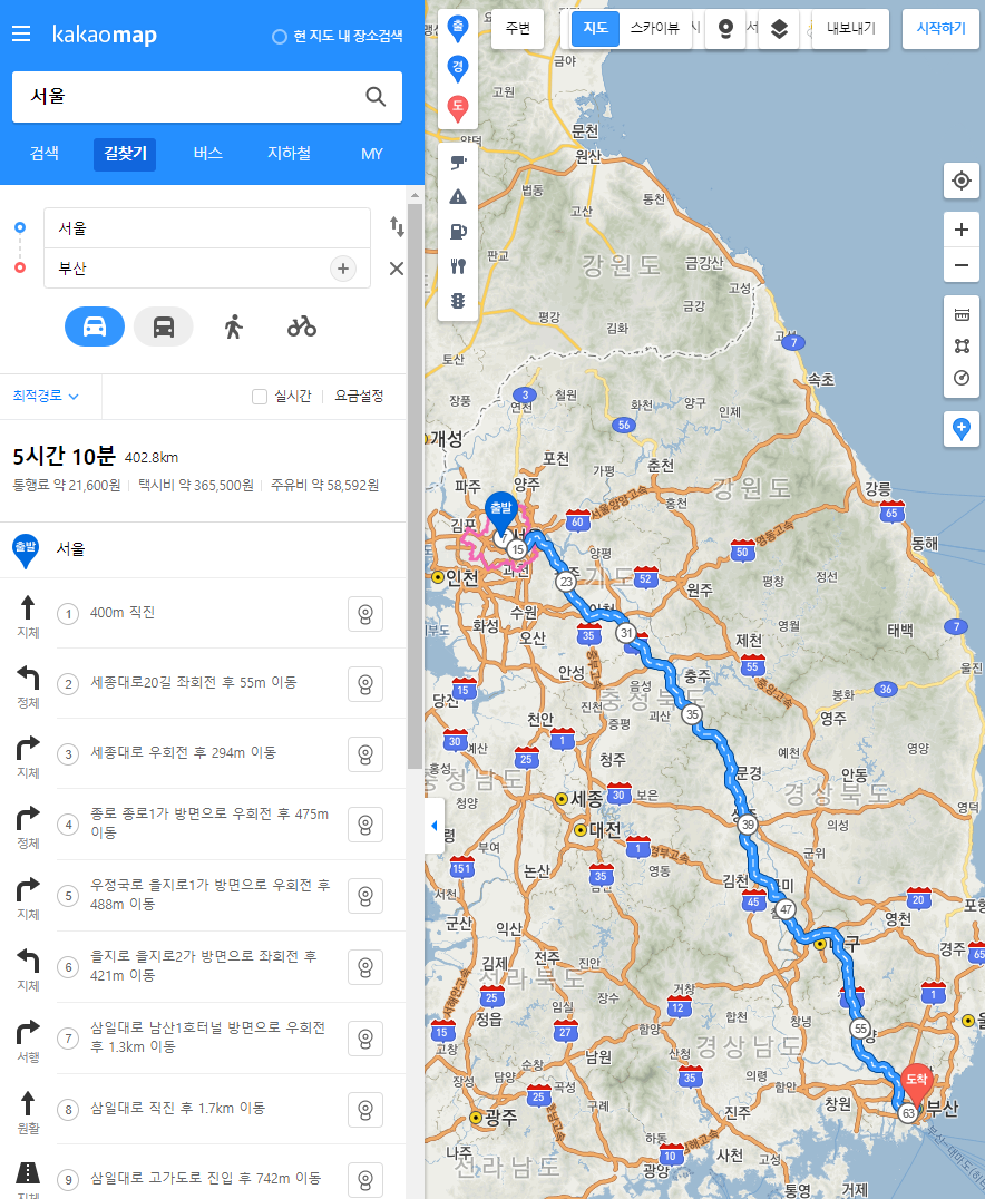 예를 들어, 서울에서 부산으로 가는 길찾기를 실행한 방법입니다. 목적지에 서울을 입력한 후, 도착지에 부산을 입력합니다. 그리고 이동수단을 선택하면 그에 맞는 길을 안내해 줍니다. 상세한 이동 방법과 지도상의 표시가 눈에 띄는 부분입니다.