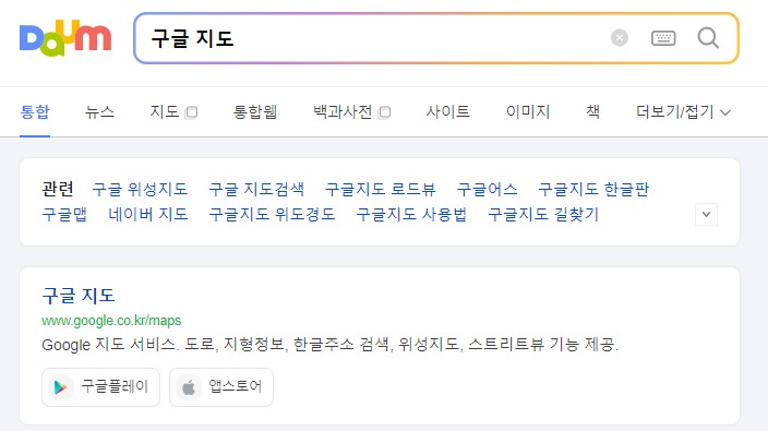 1. 다음 검색을 통해 구글 지도 공식 홈페이지를 찾습니다. 공식 사이트는 제일 위에 있기 때문에 쉽게 찾을 수 있습니다.