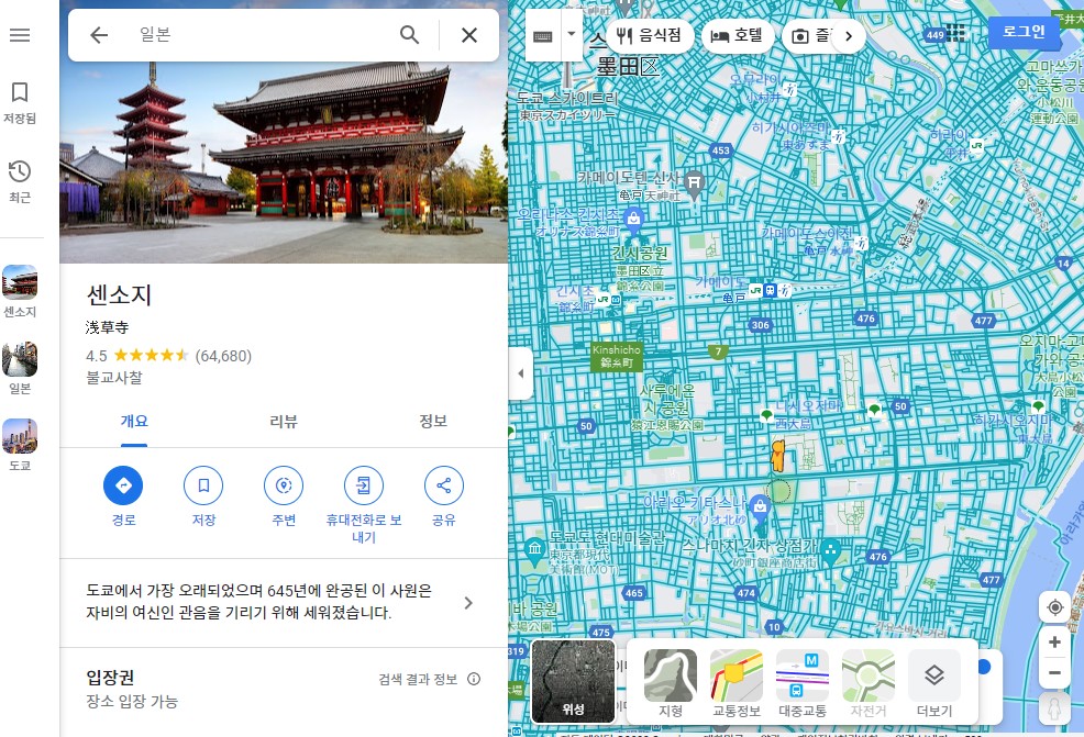6. 지도의 지리 정보 뿐만 아니라, 음식점, 관광지와 같은 정보도 확인할 수 있습니다. 아래 사진과 같이 레이어를 선택하면 여러 유형의 지도를 볼 수 있습니다. 지형, 교통정보, 대중교통 등을 선택하여, 표시된 지도를 볼 수 있습니다.