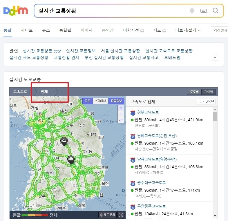 1. 다음 검색 페이지에서 실시간 교통상황을 검색합니다. 해당 검색 결과로 아래 사진과 같이 나타나게 됩니다. 여기서 주된 정보는 교통상황이지만, 지도를 통해 길의 모습도 확인할 수 있습니다. 지도 위에 있는 '전체'를 선택합니다.