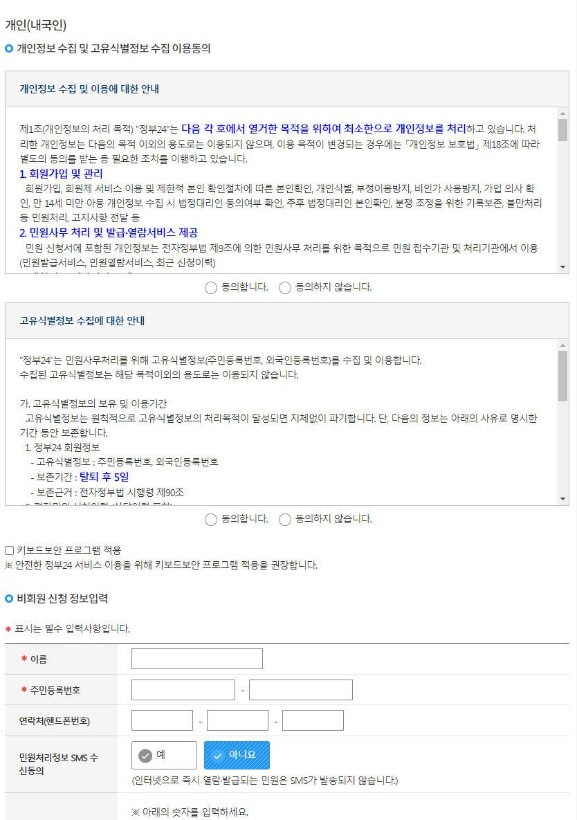 4. 일반적으로 비회원 신청을 많이 하는 것 같습니다. '비회원 신청하기'를 선택하시면, 개인(내국인), 비회원 신청 정보 입력등의 기입을 합니다.
