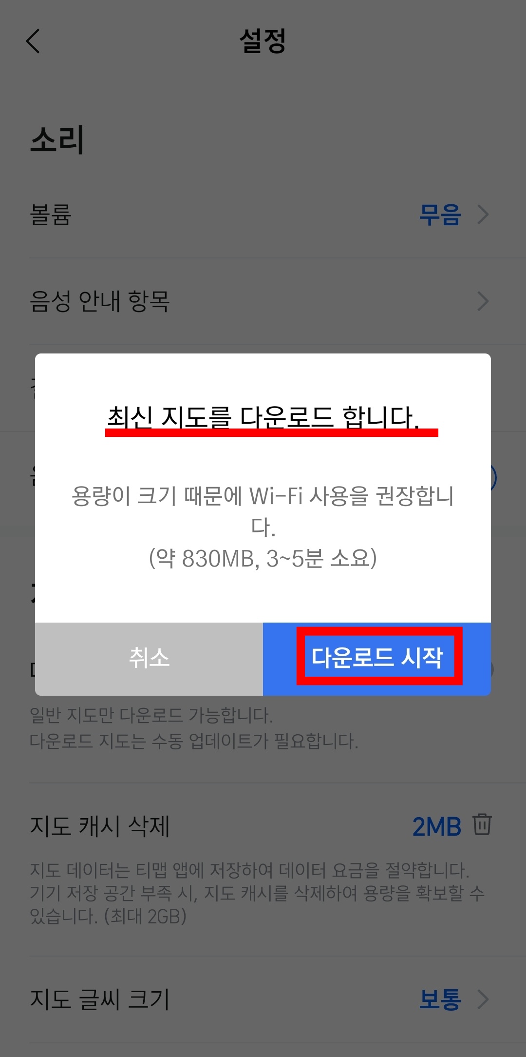5. '최신 지도를 다운로드 합니다.'라는 메시지가 뜹니다. 여기서 다운로드 시작을 진행합니다. 도로 상황등이 반영된 최신지도를 사용하는 것이 좋겠죠.