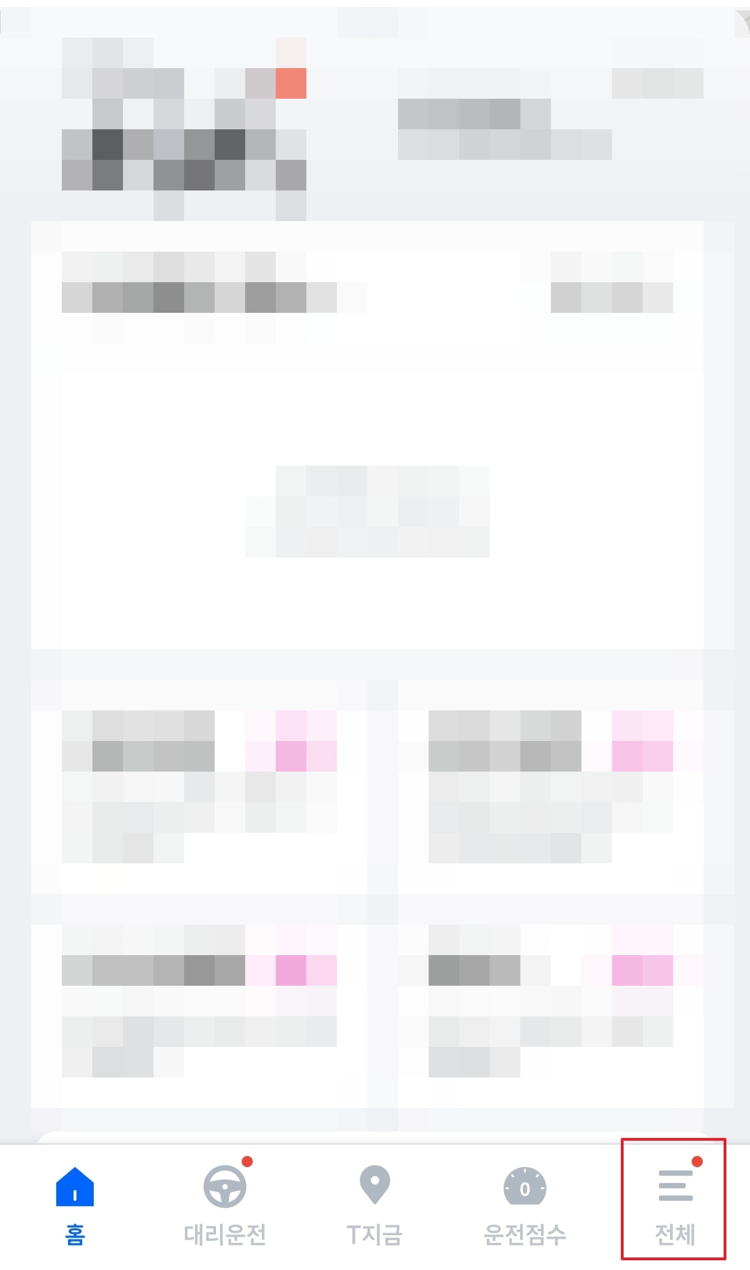 2. 티맵 메인 화면에서는 하단에 메뉴들이 있습니다. 가장 오른쪽에 있는 '전체'를 터치합니다.