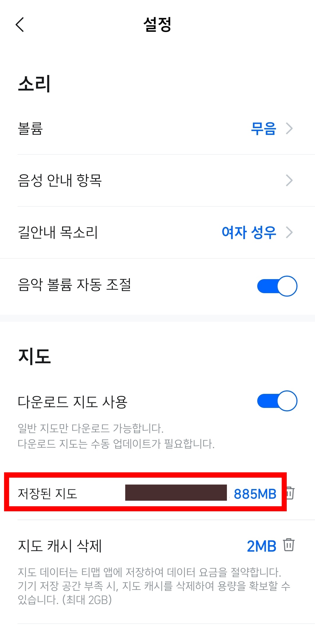4. 설정 화면에는 다양한 기능이 있습니다. 중간쯤에 있는 지도 메뉴에서 '다운로드 지도 사용'을 터치합니다.