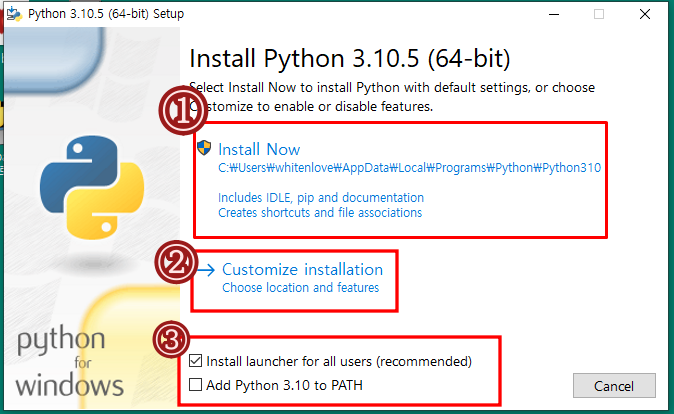 ③ 앞에서 언급한 파이썬 path 경로를 등록하는 항목이 있습니다. 이 또한 처음이라면 체크를 하셔서 진행하실 것을 추천합니다. 지정하지 않은 경우, 별도의 path를 등록하셔야 cmd에서 간편하게 파이썬을 활용할 수 있습니다.