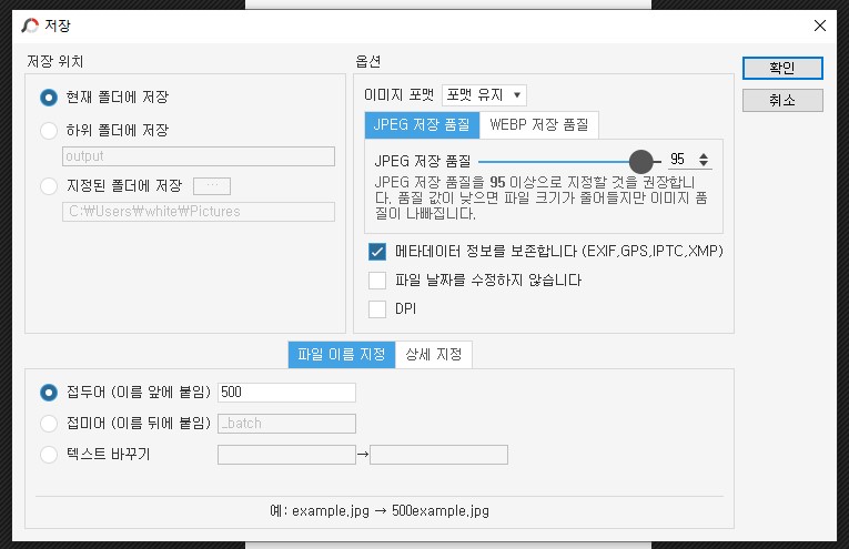 5. 이미지 일괄 편집 설정이 끝나면 하단에 '저장' 메뉴를 클릭합니다. 저장할 때 포맷을 변경하거나, 이름을 설정할 수 있습니다.