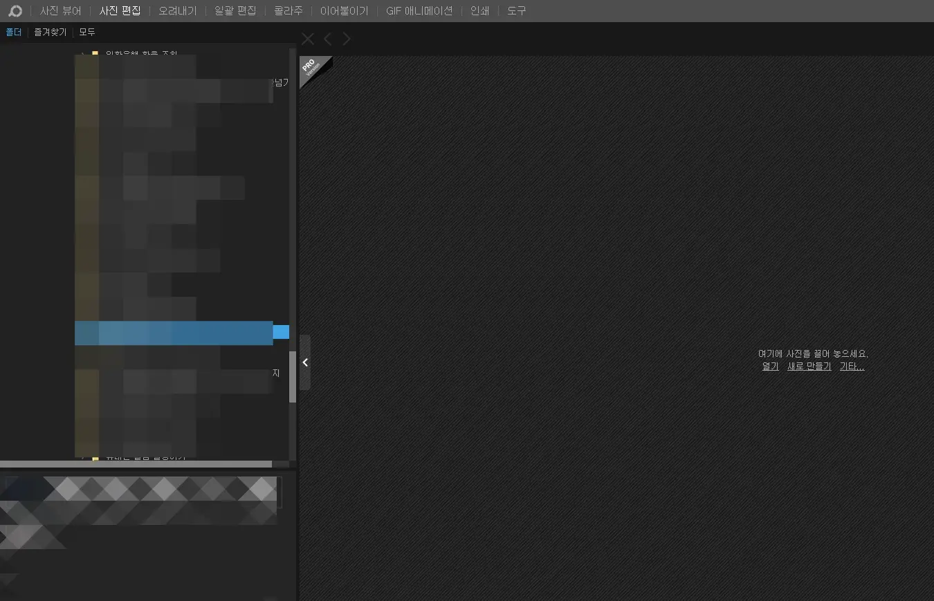 3. 일괄 편집을 선택하면 왼쪽 영역에 폴더를 선택할 수 있습니다. 폴더를 선택하면 해당 폴더의 이미지 파일이 보입니다. 원하는 이미지를 선택한 후, 오른쪽으로 드래그 엔 드롭하여 등록합니다.