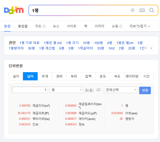 1. 1평 단위 변환 값은 3.305785 제곱미터의 결과를 확인할 수 있습니다.