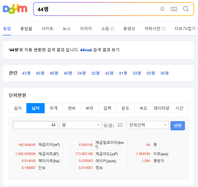 4. 조금 큰 평수인 44평은 145.45제곱미터라고 나옵니다.
