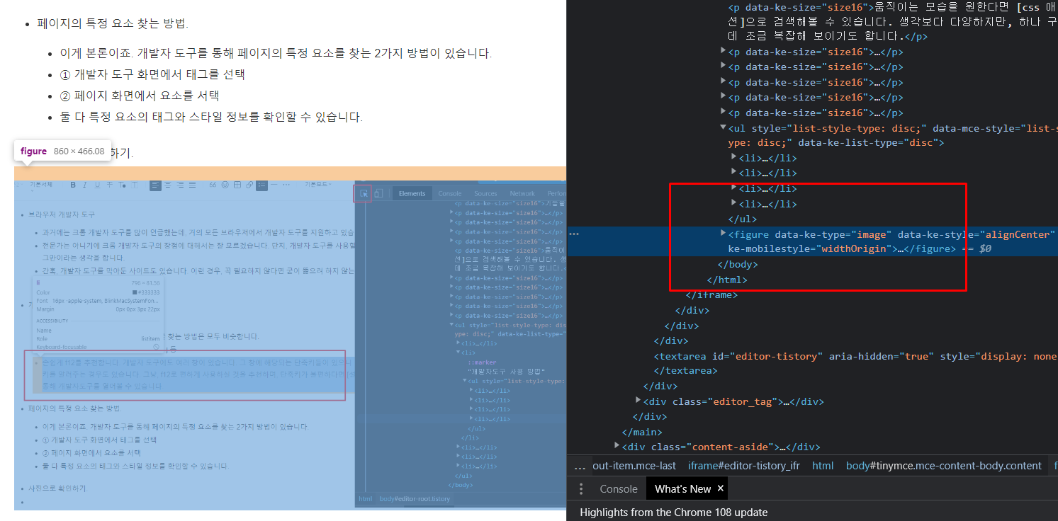위 두 사진은 블로그를 쓰는 가운데 확인한 모습입니다. 큰 차이는 없죠. 위 사진은 페이지에서 요소를 선택했습니다. 개발자 도구에서 상단 왼쪽에 보시면 페이지 요소를 선택할 수 있는 버튼이 있습니다. 해당 버튼은 사진에서 확인하세요. 두번째 사진은 개발자도구에서 보여지는 html 태그를 선택한 모습입니다. figure 태그를 선택하니 페이지에도 표시되는 것을 확인할 수 있습니다.