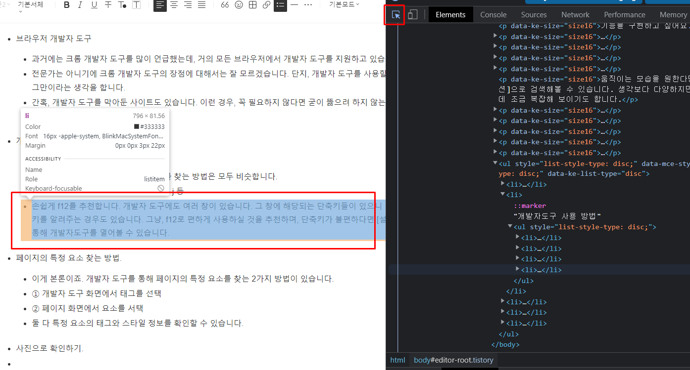 위 두 사진은 블로그를 쓰는 가운데 확인한 모습입니다. 큰 차이는 없죠. 위 사진은 페이지에서 요소를 선택했습니다. 개발자 도구에서 상단 왼쪽에 보시면 페이지 요소를 선택할 수 있는 버튼이 있습니다. 해당 버튼은 사진에서 확인하세요. 두번째 사진은 개발자도구에서 보여지는 html 태그를 선택한 모습입니다. figure 태그를 선택하니 페이지에도 표시되는 것을 확인할 수 있습니다.